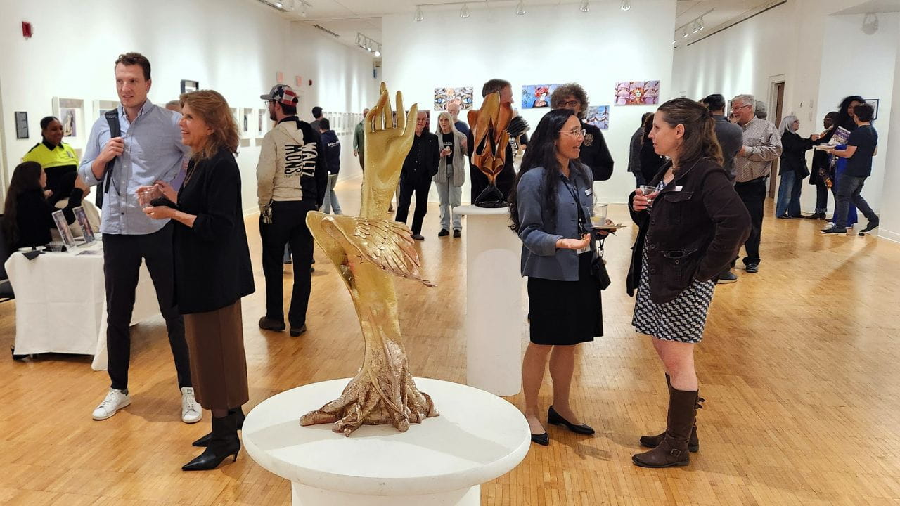 Nawrocki highlighted that the reopening of Schelfhaudt Gallery marks an exciting moment at UB. “The ribbon-cutting and opening reception for AI: Co-Create signals not only the relaunch of the gallery and Arnold Bernhard Center, but also the coming together of art, innovation, and community,” she said. “Seeing students, staff, faculty, and community artists engage in conversation, interact with exhibits, mingle, and celebrate was inspiring.”