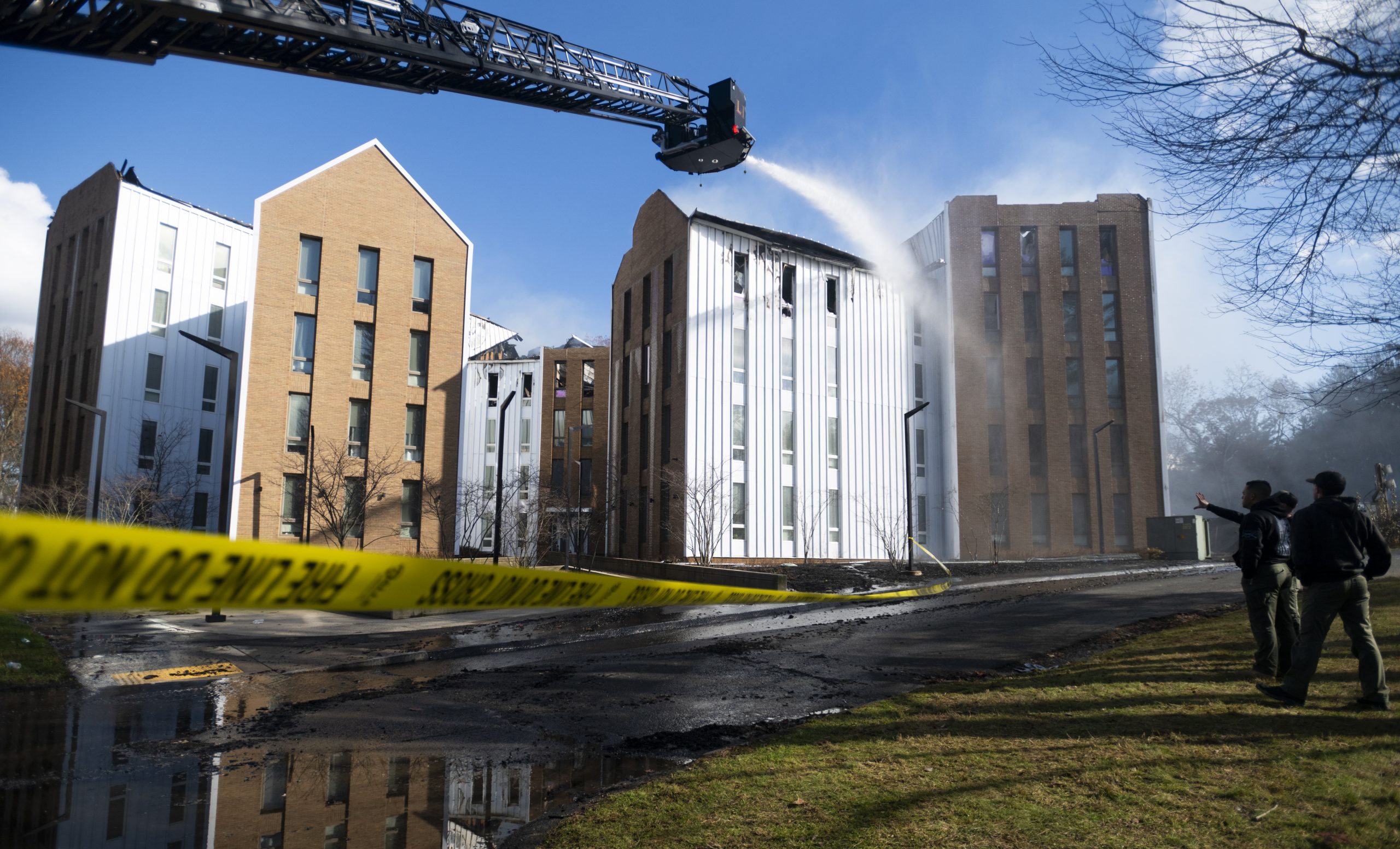 First arriving units on scene Friday found a building that was under construction at 47 Olympia Drive fully involved in fire. The intensity of the fire along with the wind caused it to spread to the nearby building at 57 Olympia Drive, known as Olympia Place, occupied mostly by college-age students. The building at 47 Olympia Drive collapsed during the fire.