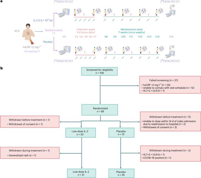 Major exclusion criteria included presentation with refractory cardiogenic shock or cardiac arrest, those receiving oral or intravenous immunosuppressive therapy, patients with diabetes on insulin therapy and patients with thyroid disorders. Due to the paucity of safety data in pregnancy for low-dose IL-2, women of childbearing potential were excluded. The full inclusion and exclusion criteria can be found in the trial protocol.