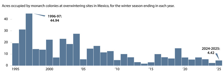 Over the past two years, the butterfly population in overwintering sites has shown signs of recovery. It nearly doubled between the 2024 and 2025 seasons, covering roughly 4.4 acres of forest in Michoacán and bordering Mexico state last year. This year, the population in the five sanctuaries that make up Mexico’s Monarch Butterfly Biosphere Reserve grew by 64%, covering 7.24 acres of forest.